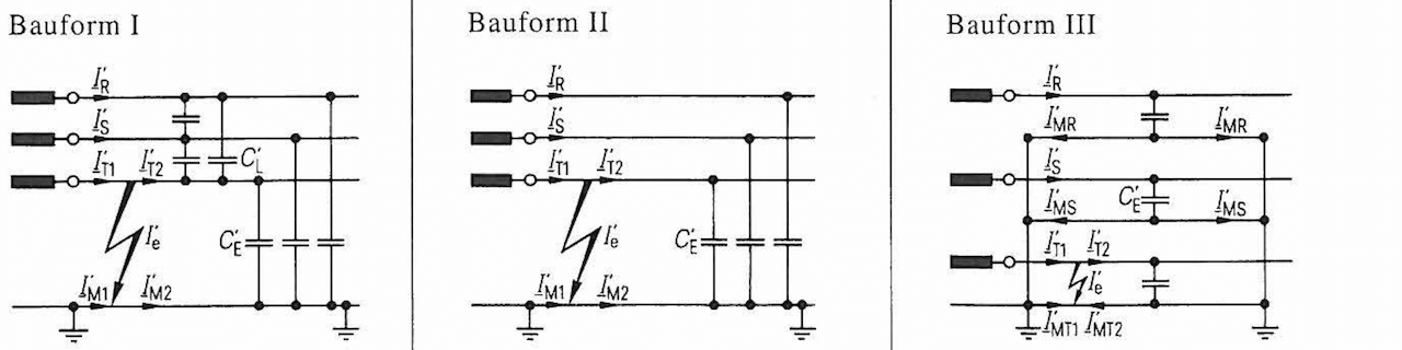 In the case of cables of design I and II, the earth fault current $I_Ce$ flows from the faulty conductor T, for example, to the sheath or shield and from there via the conductor-sheath capacitance per unit length to the intact conductors R and S that are at the full delta voltage.