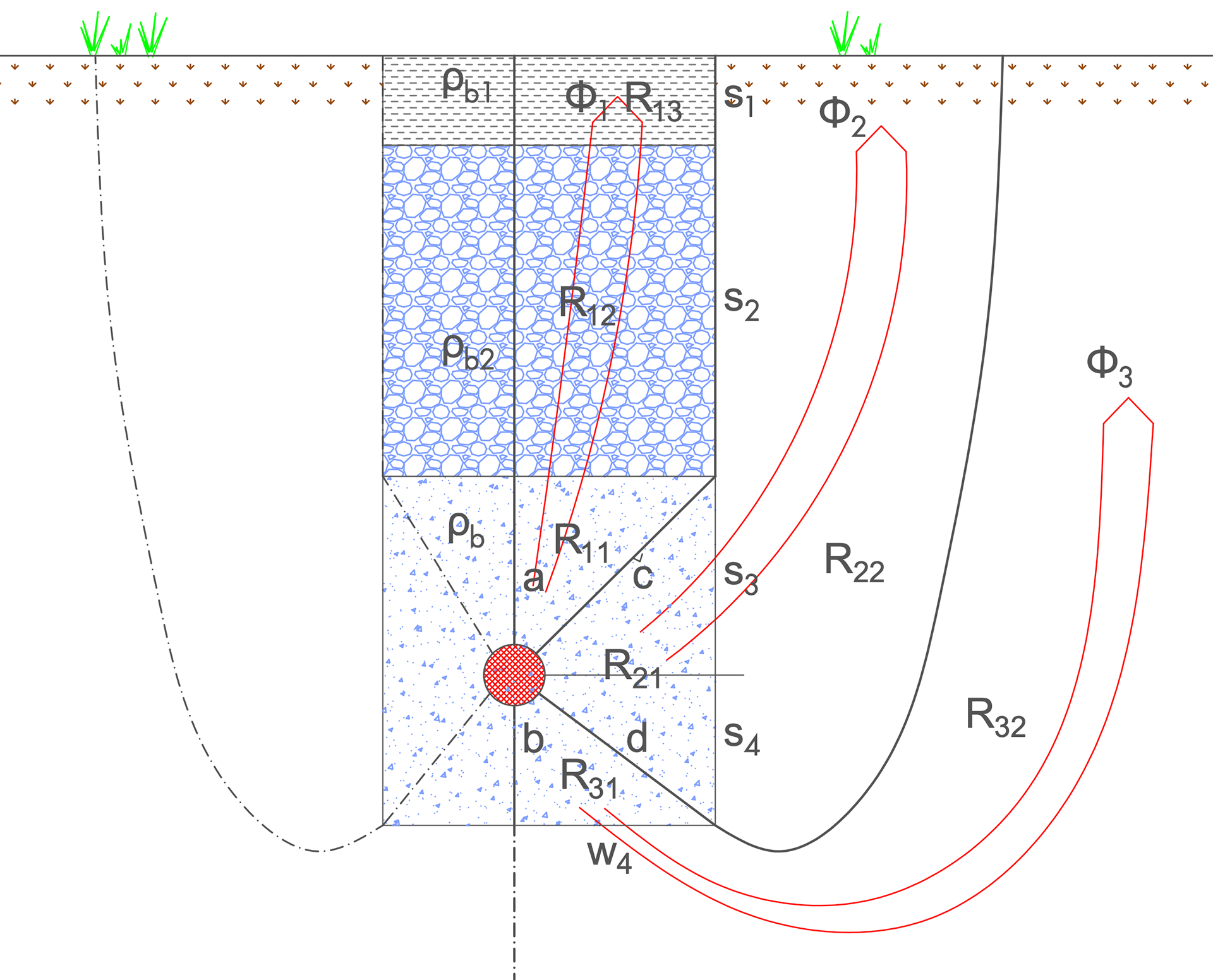 All resistances $R_q$ are calculated once for the side with shorter distance to the backfill boundary, and once for the other side. The resistances were defined in the paper by R. de Lieto Vollaro et.al: 'Experimental study of thermal field deriving from an underground electrical power cable buried in non-homogeneous soils', 2014. The total resistance to ambient $T_{4iii}$ is calculated by taking the two values of $R_{CG}$ for the two sides in parallel.