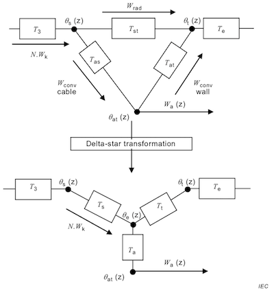 A delta-star transformation is used to derive the following parameters used to calculate the equivalent thermal resistance of the surrounding soil of a tunnel: