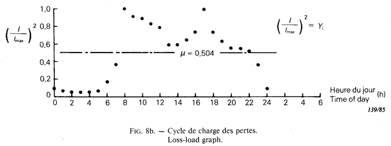For the Neher McGrath, Heinhold and the Dorison method, the power and energy losses are not obtained from directy measurements. Their estimations are based on previous knowledge of their own loss factors. The loads present nearly constant power factor, and express both the demand and energy in p.u. of their respective maximum values. Thus, the loss factor can be expressed in relation to the demand. The consumer diversity and the different consumer behaviours in areas with different geographical and socioeconomic characteristics has an influence on the loss factor. The loss factor could be obtained by using the load curves of all customers which is not viable. Based on measurement campaigns, characteristic curves for consumers separated by groups (e.g. tariff groups) are obtained. The technical losses in the systems can be divided in two large groups: independent (constant) losses of the load like losses in the transformer cores with with $\mu$ = 1 and the depended (variable) losses of the load such as ohmic losses with $\mu$ < 1. All the studies in the search for a relationship between the loss and the load factor led to the same empiric equation below (first equation).